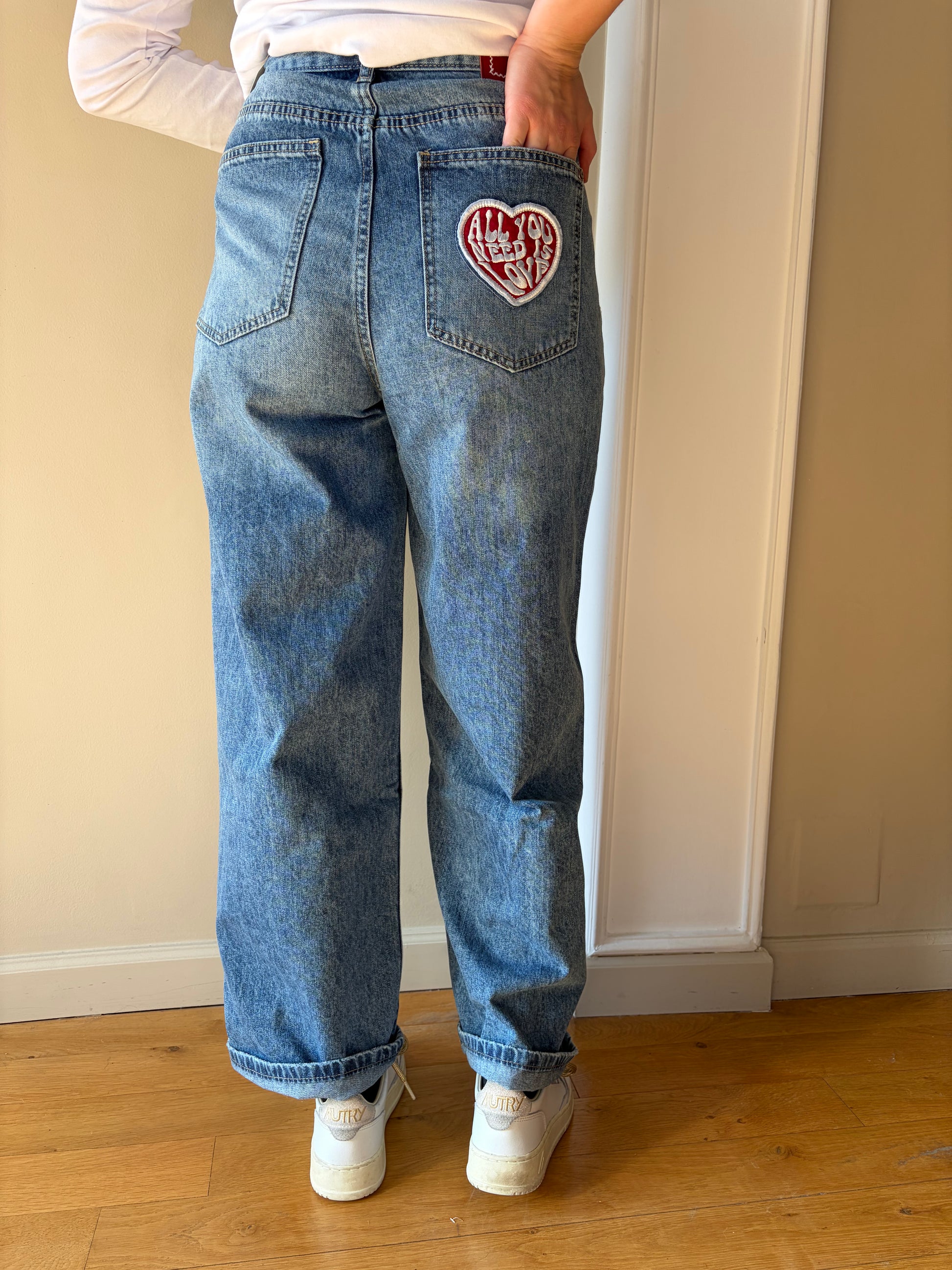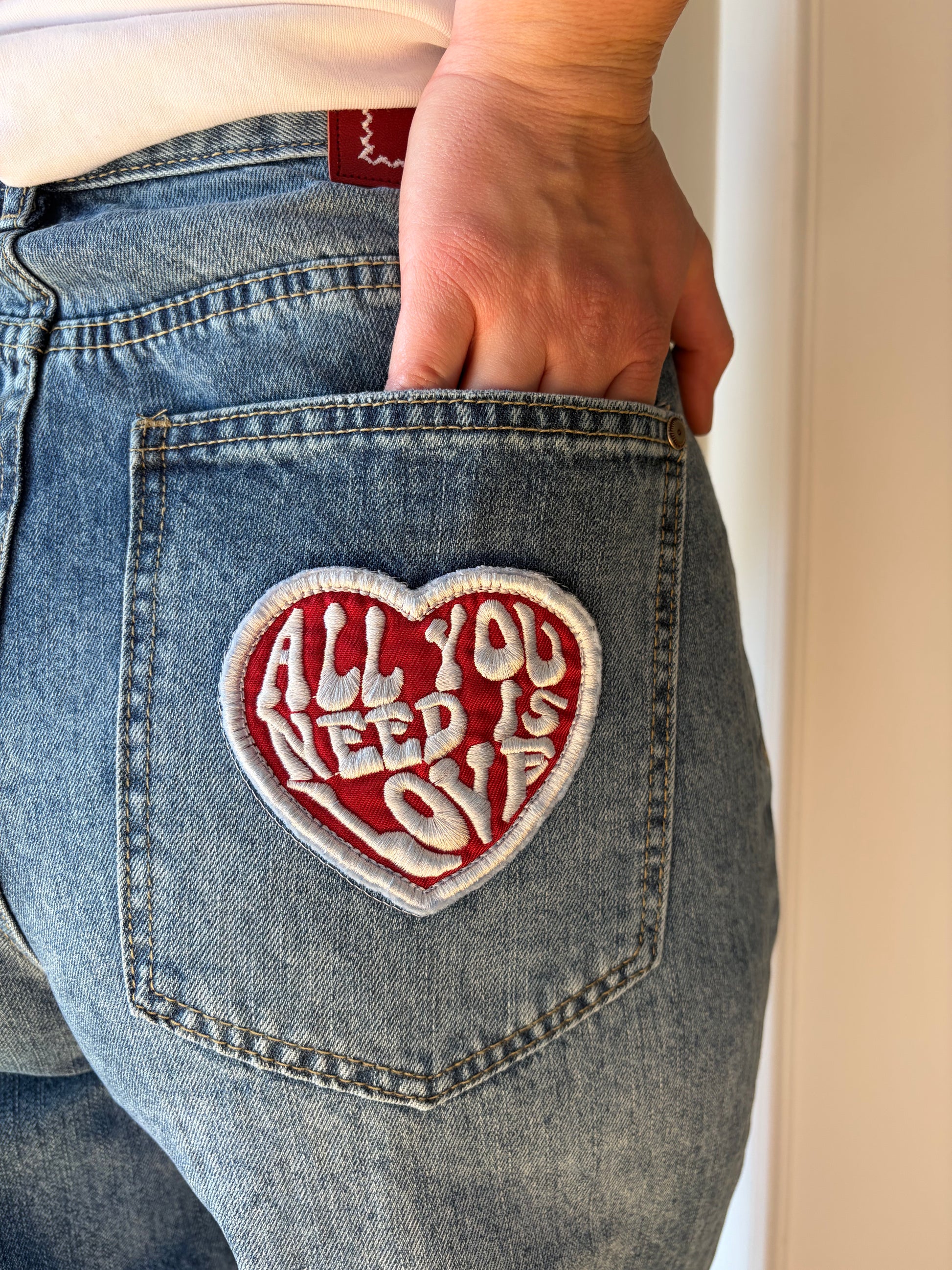 - Empiècements "all you need is love" sur la poche arrière